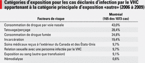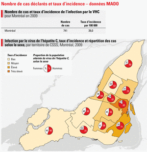 L’infection par le virus de l’hépatite C (VHC) se transmet par exposition percutanée à du sang infecté; il est à noter que la transmission sexuelle est possible quoique rare. Au Québec, le principal mode de transmission du VHC est le partage de matériel d’injection. Il n’existe pas de vaccin pour prévenir cette infection. L’infection au VHC est souvent asymptomatique et seulement 15-25% des personnes infectées guériront spontanément; 75-85% des personnes infectées deviennent donc porteuses chroniques de l’infection et demeurent contagieuses. La principale complication du VHC est la cirrhose du foie qui survient en moyenne chez 20% des personnes atteintes d’hépatite C chronique. On estime que 20% des personnes qui souffrent d’une cirrhose causée par ce virus développeront un cancer du foie (carcinome). Bien qu’il s’accompagne de plusieurs effets secondaires et nécessite un suivi soutenu, il existe un traitement pour cette infection et le taux de guérison se situe entre 45 et 85% selon le génotype. Il est à noter que moins de 10% des personnes infectées par le VHC à Montréal auraient débuté un traitement.